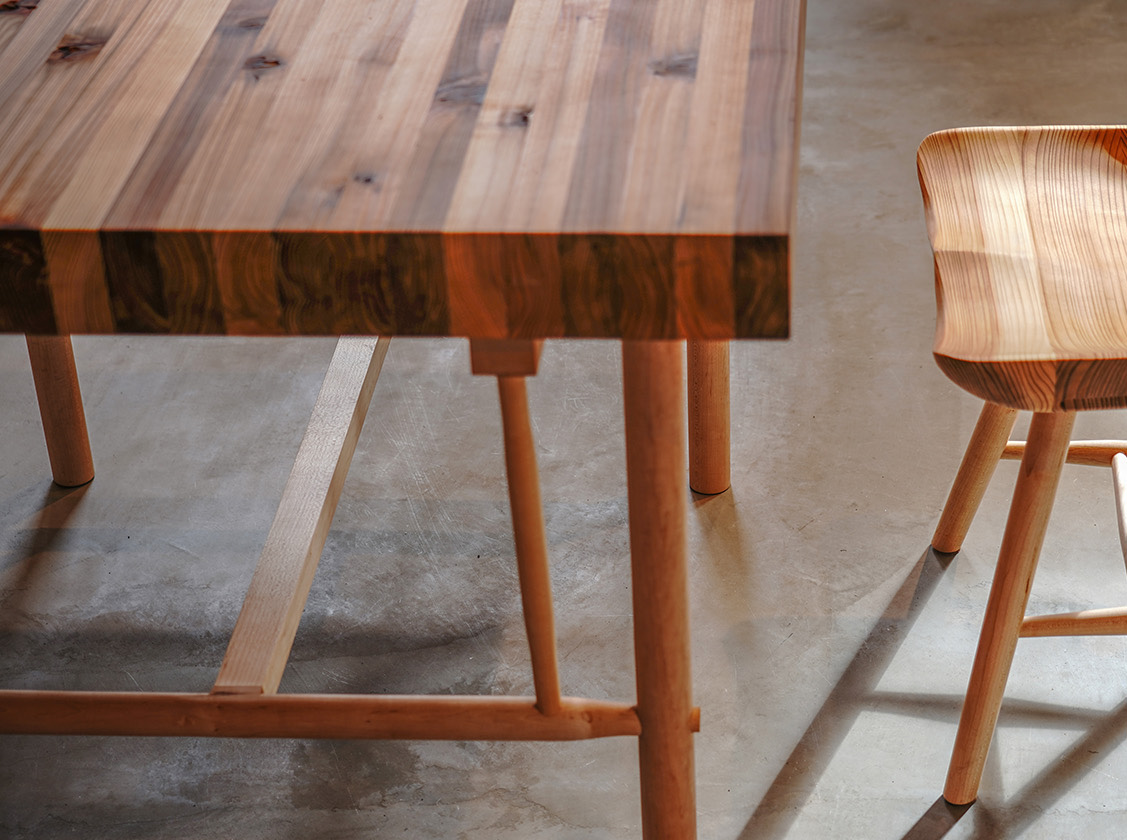 秋田杉板を縦使いに巾はぎすることで特徴的なストライプの表情を生み出した天板は、温かみがありつつも重厚な存在感を醸し出します。